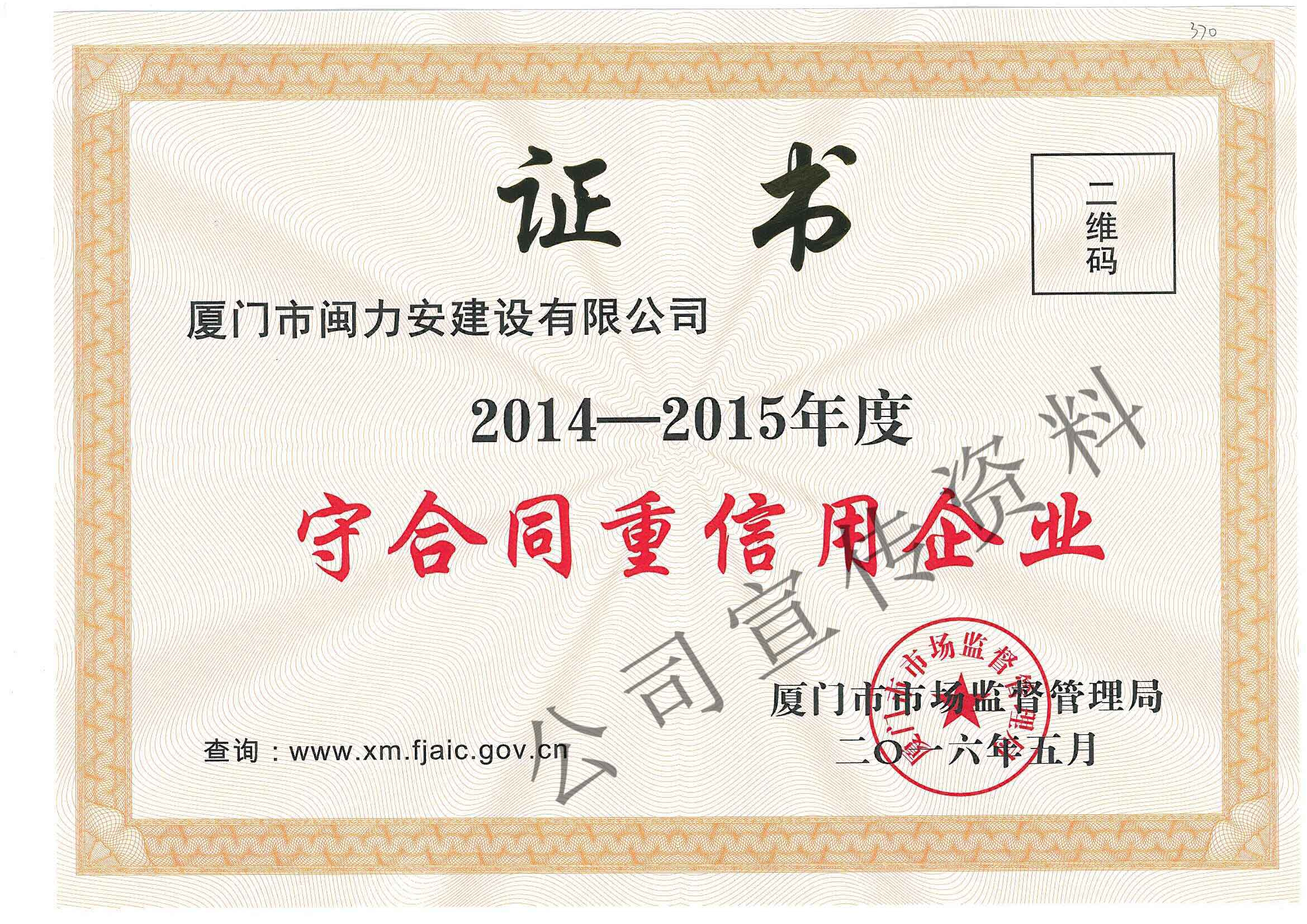 祝賀閩力安榮獲:廈門市重合同守信用企業